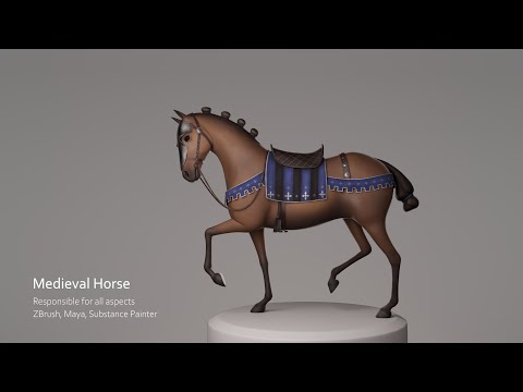 I made this medieval horse for my character Joan to ride in my thesis film Immémoriale. The horse is proportionate to Joan's rig and is made to fit her figure. I modeled the horse in ZBrush with additional hard-surface details finalized in Maya and rigged with Advanced Skeleton. I added a rig control to the stirrups and used nCloth to simulate the reins. I enjoyed the challenge of creating a stylized but realistic horse with medieval elements and later studying horses' movement for animation.
