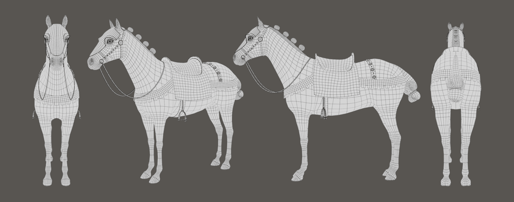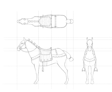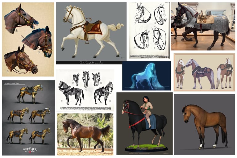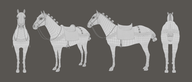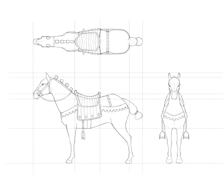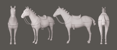I made this medieval horse for my character Joan to ride in my thesis film Immémoriale. The horse is proportionate to Joan's rig and is made to fit her figure. I modeled the horse in ZBrush with additional hard-surface details finalized in Maya and rigged with Advanced Skeleton. I added a rig control to the stirrups and used nCloth to simulate the reins. I enjoyed the challenge of creating a stylized but realistic horse with medieval elements and later studying horses' movement for animation.