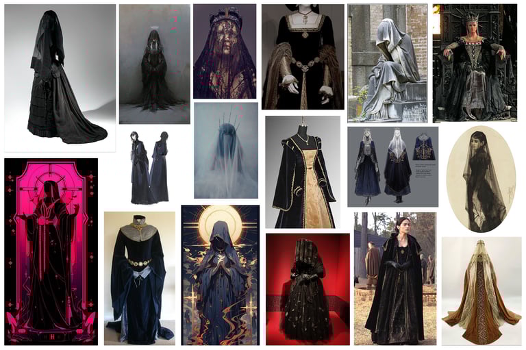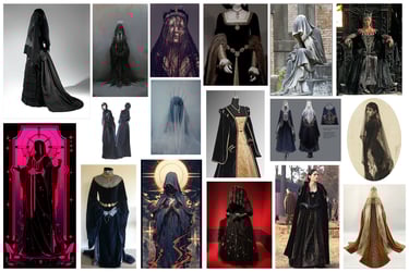 I was inspired by the silhouettes of Victorian mourning dress and medieval and renaissance fashions. I also wanted to play with the sheerness of the fabric to give a more ethereal and ghostly effect.